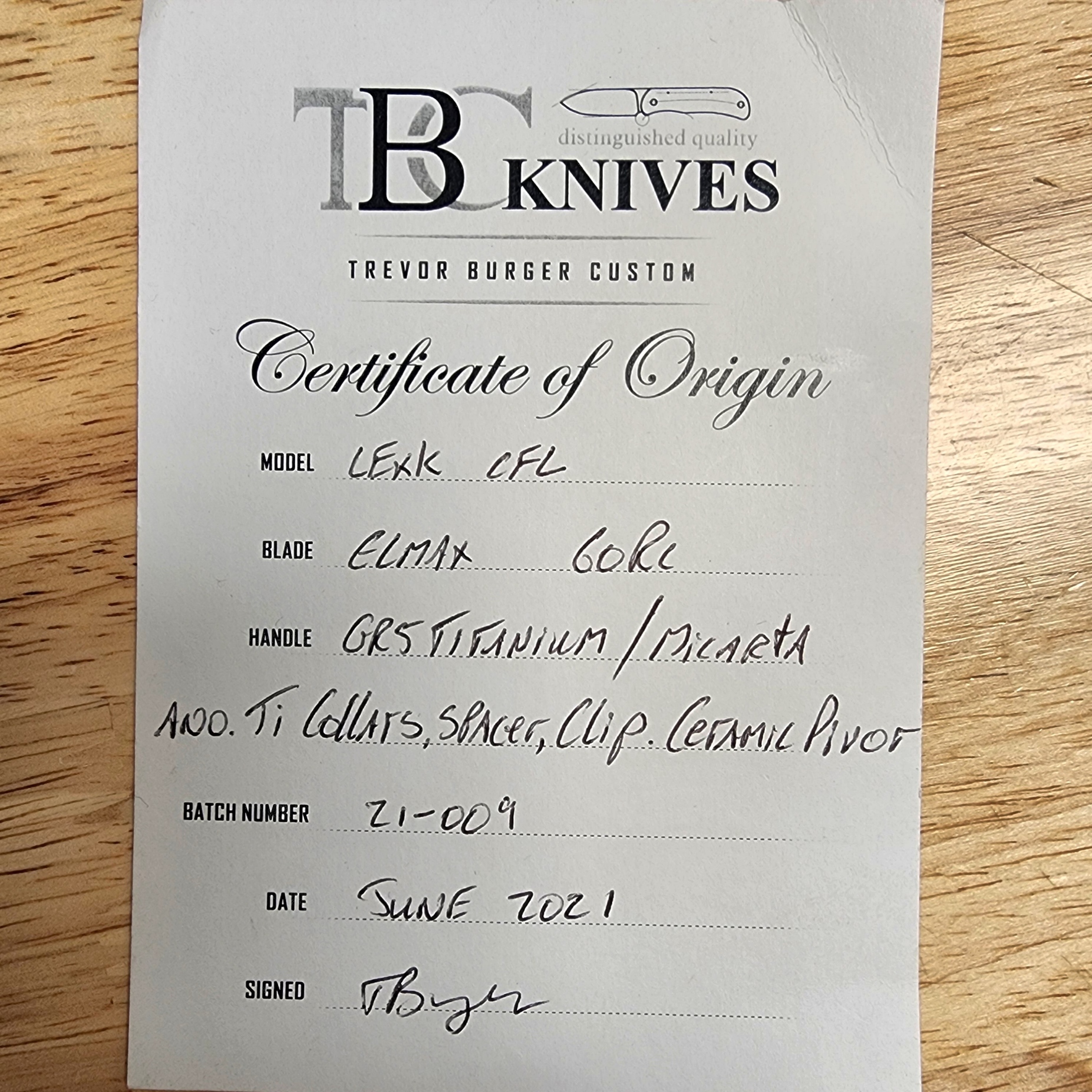 Trevor Burger Model LEXK CFL Titanium Micarta Inlay Elmax Satin Grind